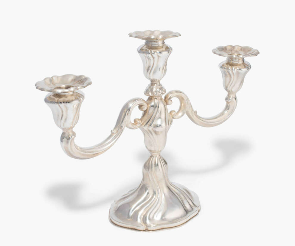 Silber (Bodenplatte Metall). Herstellermarke Bruckmann & Söhne. Ovaler, fassonierter Fuss, darüber Balusterschaft mit dreiflammigem Leuchter. Herstellermarke, Feingehalt 800. H 25 cm.