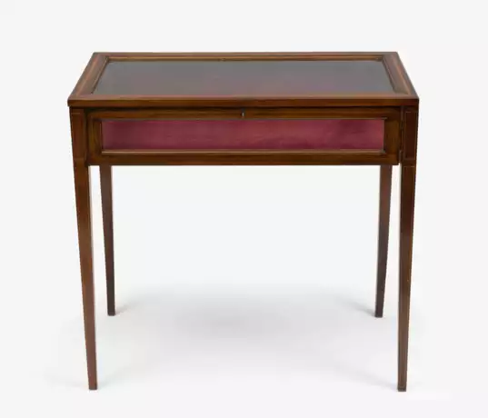 Um 1900. Nussbaumholz mit eingelegten Filets. Rechteckige, dreiseitig verglaste Zarge auf schlanken Pfeilerbeinen. Aufklappbare Deckplatte mit facettiertem Glaseinsatz. Innen mit rotem Samt ausgeschlagen. 84 x 46, Höhe 82 cm.
