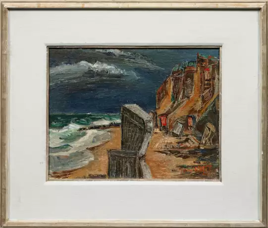 Darstellung im Stil des Expressiven Realismus, wohl Strandmotiv von Sylt. Tom Hops gehörte zu den bedeutendsten Hamburger Künstlern nach 1945 und erhielt 1960 den Edwin-Scharff-Preis, 1974 wurde er zum Professor ernannt. Außer Hamburg selbst waren norddeutsche Landschaften ein Hauptsujet Hops', darunter Sylt. Öl/Lwd.; R. u. sign. u. dat. (19)65. Verso nochmals sign. u. betitelt, Stempel mit Hamburger Künstleradresse. 27,5 cm x 35,5 cm. Rahmen.