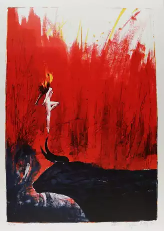 Die Triton Künstlergruppe bestand aus Horst Hägele (geb. 1944), Bertram Wolf (1946) u. Dieter Seyfried (vor 2017 verstorben). - Zeus und Europa. 1997. 2 Ex. von 500. - Der Traum des Ikarus. 1998. 2 Ex. von 550. - Al-Kasneh (Schatzhaus) in Petra. 1993. 2 Ex. von 450 u. eines bez. "Probe". - Das Jaswant Thada-Mausoleum über verschneiter hügeliger Landschaft schwebend. 1996. 3 Ex. von 600. - Tänzerin beim Sprung über eine Mondsichel, am re. Rand ein weiblicher Torso. 1994. 2 Ex. von 550, 2 bez. "Probe" (sign. von Hägele u. Seyfried) bzw. "EA". - Tls. leichte Lagersp. - ╔Dabei: Dies.╗ Gedanken. 1x 1984, 3x 1987. 4 Farblithographien 1984-87. Blgr. 59,5 x 42 cm. Jwls. von allen drei Künstlern sign, dat. u. num. (2), bzw. bez. "EA" u. "Probe". Jwls. in grauer Pp.-Mappe (61 x 43 cm) mit aufgedr. Titel. - ╔Dies.╗ Feuriges Rot (2x). - Wildes Grün (3x). - Starkes Blau. - Träumendes Violett. 7 farb. Offsetlithographien 1989-92. Blgr. je 36,5 x 36,5 cm. Jwls. von den drei Künstlern sign., dat. u. num. bzw. bez."EA" (6). Jwls. in Kart.-Mappe (37 x 34 cm) mit rechteckigem Ausschnitt (5 x 5). - Eines von 500 Ex. Alle 25 St. in Ohlwd.-Mappe mit aufkasch. Titelschild "Kunstmappe von Werbeagentur MAC und HWS Werbestudio für gesammelte Werke von 1993-2001". - Die Agenturchefs Horst Hägele, Bertram Wolf und Dieter Seyfried der Pforzheimer Werbeagentur HWS/MAC zählten seit den 80er-Jahren drei Jahrzehnte lang zu den Top 100 Agenturen in Deutschland. mit Schließbändern.