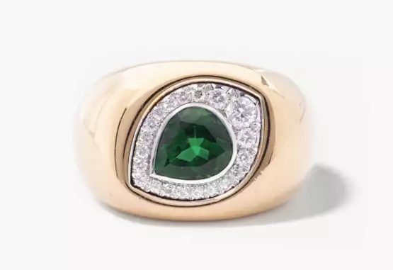 Péclard. 750 Gelbgold. Tropfenförmig geschliffener Tsavorit, 7,5x6,2 mm, ca.1.41 ct umrundet von Brillantpavé in einer bombierten Ringschiene. Gr. 44, 18 g. Mit Box.