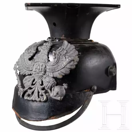 Schwarz lackierte Lederglocke (berieben, kleine Druckstellen) mit aufgesplintetem Kuvert (ein Splint ergänzt) aus schwarz lackiertem Eisenblech mit grauen Metallbeschlägen. Linienadler (Lederkeile fehlen) aus Buntmetall mit grauer Oberfläche. Knopf 91 und Vorderschirmschiene (vom Schirm gelöst) aus grauem Eisen. Gut erhaltenes ockerfarbenes Lederlaschenfutter (Risse). Lederkinnriemen, Kokarde sowie Feldzeichen fehlen. Teilweise leicht beschädigt, Altersspuren.