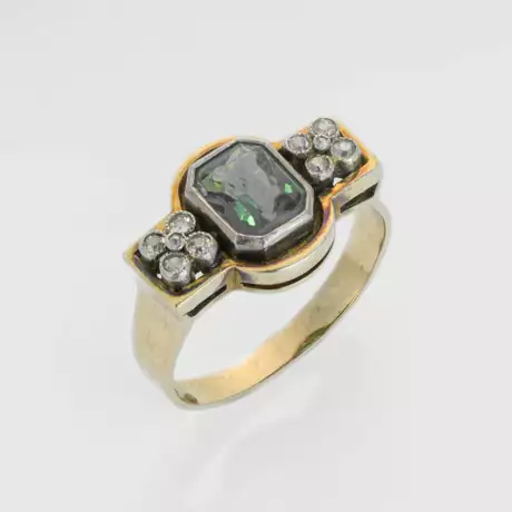 Gelbgold, gest. 585. Zentral besetzt mit einem türkis-grünen Turmalin, flankiert von Diamantrosen. Gew. ca. 4,72 g.