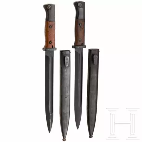 Beide SG mit der orig. Brünierung, Holzgriffschalen, WaA-Abnahme, Hersteller "43ffc" und "cof44", nicht nummerngleich mit der Scheide. Alters- und Gebrauchsspuren.
