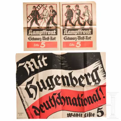 "Mit Hugenberg deutschnational - wählt Liste 5" mit schwarz-weiß-roter Fahne und entsprechender Aufschrift, "Verlag der Deutschnationalen Schriftenvertriebsstelle ... Plakat Nr. XII". Maße ca. 58 x 42 cm. Dazu ein weiter Aushang sowie mehrere Briefe, Zeitungsblätter und -ausschnitte.