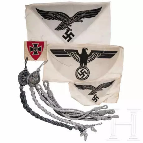 4. Stufe des Heeres mit drei anhängenden Eicheln und der unrichtigen gedunkelten Auflage der Panzertruppe (ohne rs. Abdeckung). Ein 1. Stufe der Luftwaffe. Außerdem zwei Webadler für die Sportbekleidung der Luftwaffe und einer des Heeres sowie ein Webabzeichen des Reichkriegerbundes. Dazu vier Mützenkordeln.