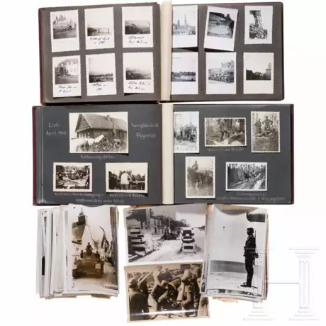 Fotoalbum eines Soldaten mit Aufnahmen aus Frankreich (Paris), Belgien und dem Balkan. Die Aufnahmen zeigen französische Kriegsgefangene, zerstörte Gebäude und Fahrzeuge, die Front, Kriegsgerät usw. Die Fotos sind teilweise beschriftet, insgesamt ca. 180 Fotos. Fotoalbum eines Soldaten, welcher im Artillerie-Regiment 196 an der Ostfront diente. Aufnahmen von der Front, täglicher Dienst, Härte des russischen Winters, Gräber der Gefallenen, Kriegsgerät, Geschützstellungen, Sturmgeschütz-Foto, Einsatzorte wie Newa, Otradnoje, Wolchowfront, Nowinka usw. Ein Großteil der Seiten ist beschriftet. Auf den letzten Seiten noch weitere Fotos: Adolf Hitler, Hermann Göring, Frankreich, Beerdigung Paul von Hindenburgs sowie ein paar Nachkriegsaufnahmen des Soldaten, insgesamt 155 Fotos. Pressefotos vom Westfeldzug (Frankreich), rückseitig mit den typischen Informationen, Bildformat 18,5 x 13 cm, insgesamt ca. 102 Fotos. Alters- und Gebrauchsspuren.
