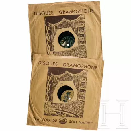 „Gloria"-Schallplatte, gespielt von der SS-Kapelle der Standarte 36, mit folgenden Liedern: „Germania-Marsch" und „Kreuzritter-Fanfare", eine weitere Schallplatte der Fa. Imperial, gespielt vom Musikkorps des Infanterie-Regiments 67, mit folgenden Liedern: „Schneidige Truppe" und „Fliegermarsch". Beide mit Hülle, leichte Alters- und Gebrauchsspuren.