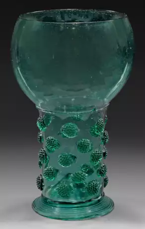 Grünes Glas mit gepressten und gekniffenen Auflagen. Auf gesponnenem Fuß zylindrischer Hohlschaft mit Beerennuppen. Am Übergang zur großen kugelförmigen Kuppa ein gekniffenes Zierband. Minim. Haarriss. H. 27,6 cm.