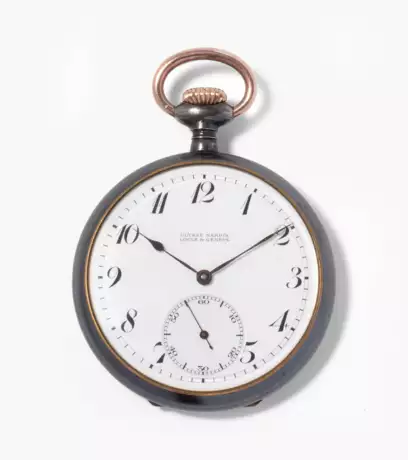 Zweischaliges, geschwärztes Silber-Lépine-Gehäuse. Der Aussendeckel mit Aussendeckel innen nummeriert 2721. Das weisse Email-Zifferblatt ist mit schwarzen arabischen Stundezahlen, Eisenbahnminuten und kleiner Sekunde bei 6 Uhr versehen. Gebläute Birne- und Lanzett-Zeiger. Das Zifferblatt signiert. Vergoldetes Brücken-Ankerwerk, Schrauben-Kompensationsunruh mit gebläuter Breguetspirale und Schwanenhals-Feinreglage. Das Werk signiert und nummeriert 63032. Ovale Gold-Ringaufhängung mit Drücker. 49 mm, 71 g. Mit originalem, bordeauxrotem Etui. Funktiontüchtig.