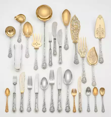 in originalem Holzkasten. Silber, teilw. vergoldet. 227-tlg.; 24 Tafelmesser, 24 -gabeln, 24 -löffel, 12 Dessertmesser, 12 -gabeln, 12 -löffel, 12 Fischmesser, 12 -gabeln, 12 Eis-, 12 Mokka-, 12 Kaffee-, 10 Teelöffel, 12 Obstmesser, 11 Austern-, 6 Fleischvorlegegabeln und 20 Vorlegebestecke, darunter Saucenkellen, Torten- und Pastetenheber. Teilw. mattierte, vergoldete, mit vegetabilen Ornamenten gravierte Laffe. Heft in Akanthusblättern ansetzend, mit konischem, doppelt geschwungenem Griff, schauseitig mit reliefierter Darstellung mehrerer Puttenund einer Katze zwischen Weinranken und Blüten, rückseitig mit Blüten und leerer Abschlusskartusche. Kasten monogr. "H". Gest. 800, Beschau- und Herstellerzeichen. Gew. ca. 9750 g. (inkl. gefüllte Objekte 14860 g.) Suppenkellen-L. 37 cm.