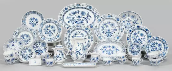 57-tlg.;12 Speiseteller, 12 Dessertteller, 5 Kuchenteller, ovale Anbietschale, Durchbruchkorb, vierpassige Muschelschale, 4 Durchbruchteller, tiefer Teller, Kaffeekanne, Sahnegießer, Mokkakanne, 6 Mokkatassen mit Untertassen, 4 Kaffeetassen mit drei Untertassen, Becher mit Untertasse, Rundtellerchen, oblonge Ablageschale, Fächerschale, große Untertasse, 2 kleine Teller. Unterglasurblauer Zwiebelmusterdekor. Partiell rest.; Minim. best./Haarriss; Schwertermarke. Kaffeekannen-H. 24,5 cm.
