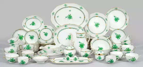 58-tlg.; Kaffeekanne, Sahnegießer, Zuckerdose, Bonbonniere, längliches Henkeltablett, 10 Tassen mit Untertassen, 10 Dessertteller, 12 flache Speiseteller, 2 ovale Gemüseschalen, ovale Anbietschale, Muschelschälchen, längsovale Anbietschale, Sauciere fest auf Untersatz, 2 große Anbietplatten, 12 Suppentassen mit Untertassen (davon 6 mit glattem und 6 mit gewelltem Rand), Salz- und Pfefferstreuer. "Ozier"-Relief mit Indianischem Dekor, sog. "Apponyi Grün" in Aufglasur mit Goldstaffage. Deckelrosen teilw. minim. best.; Manufakturmarke. Kanne-H. 26 cm. Platte 37 cm x 28,5 cm.