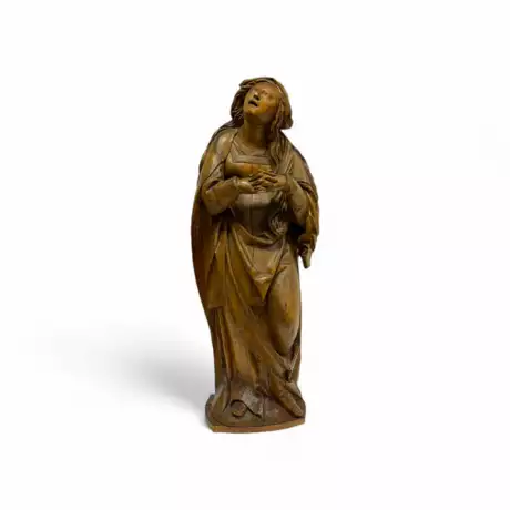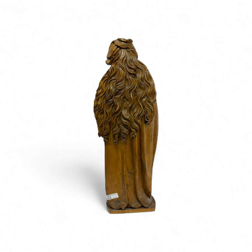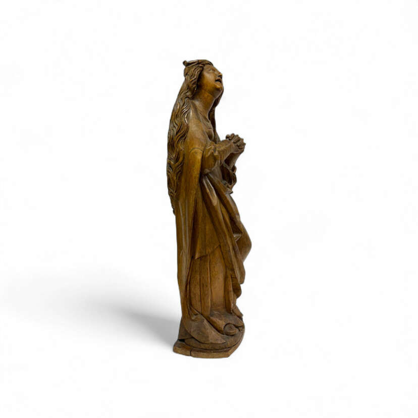 Mourning Mother of God, Germany, Upper Rhine region, 16th century, supporting figure from a crucifixion group, richly detailed wooden sculpture, fully sculpted, lime wood, height with added base plate approx. 93 cm, restorations and significant damage