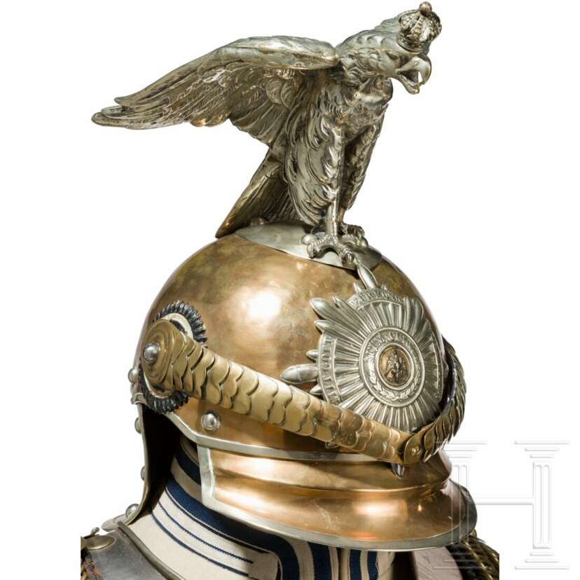 Helmet M 1867 with tombac skull (small dents), ridge at the back (soldered crack), ridged front visor, nickel-silver trim, on the rear visor "GKR.", nickel-silver guard star applied on the forehead and attached with a leather wedge, in the centre a brass medallion with central embossed eagle lacquered in black, convex, leather-backed chinscales on geometrical rosettes, on the right the large national cockade of lacquered sheet iron, the crest with nickel-silver base (stamped "GKR 3E" at the bottom) with four ball heads and parade eagle for enlisted men (one crown clasp on the reverse is missing), good black lining with leather flaps (small cracks), the front visor lacquered in green on the underside, the movable rear visor backed with black leather. Steel cuirass with appliqués of non-ferrous metal, surrounding round heads of non-ferrous metal, the back with matching features and attached leather-backed chain straps. Breast and back plates with old lining, the breast with wearer’s label "Gr. v. Schmettow 3. Eskadron". Leather cartridge box with applied embossed guard star, intact straps and recently replaced bandolier. Comes with a white belt with dark blue borders, guard braiding, blue piping and cuffs, white metal buttons, hook closure and cloth shoulder boards. Hanger for edged weapons of white leather.
