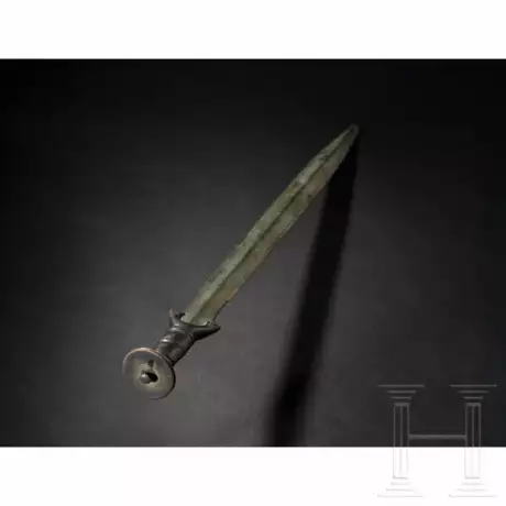 The blade is willow leaf-shaped with slightly outwardly curved cutting edges. The approx. 4 mm wide cutting edges are clearly separated from the solid middle section of the blade with a strong central ridge by a step. Below the trapezoidal upper section of the blade is a recessed, notched ricasso (blunt edge) approx. 4.5 cm long. The trapezoidal end of the blade is enclosed by a solid handle in overlay casting. At the lower end of the inwardly indented edge below the handle, there are two engraved blind rivets on both sides. At the upper end of the edge, there is a spiral decoration, which is slightly worn towards the edge. The three bulges of the slightly bulging handle are decorated with vertical notches. Above this is the conical pommel with a flat top. The underside is decorated with two rows of opposing triangles. On the top are circular eyes in the fields between a wavy line. In the center is a cylindrical pommel head surrounded by three circular lines. The pommel is pierced on one side for a leather strap to secure the sword to the hand. Beautiful dark green patina. Minor chips on both sides just before the tip. Otherwise, several nicks in the middle of the blade caused by heavy blows against an edge. This damage is probably not due to combat, but rather to ritually damaging the weapon before it was deposited. Such ritual damage (including bending or smashing into several pieces) is common in finds from this period. However, this hardly detracts from the overall appearance of this otherwise excellently preserved Late Bronze Age sword. Length 66.3 cm.
