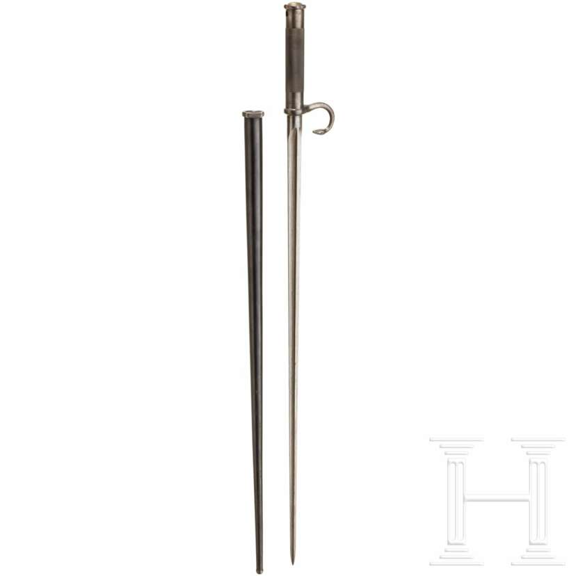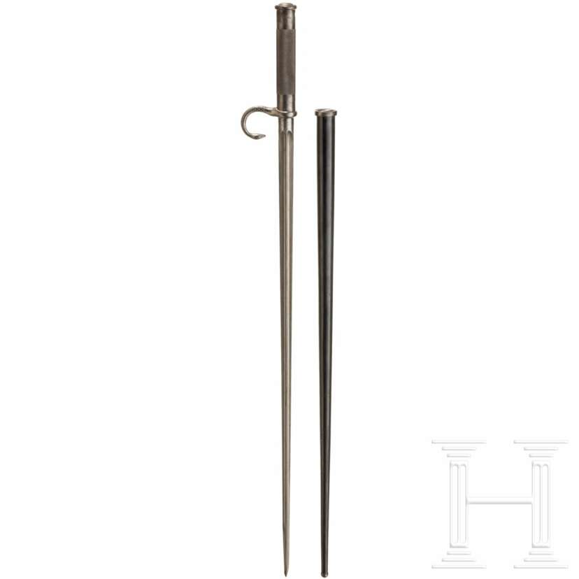 Gekehlte vierkantige Stichklinge, am Ansatz ein bekrönter gotischer Abnahmestempel. Gewaffelter Stahlgriff (Stempel "91") mit intakter Arretiervorrichtung und schlangenförmiger Parierstange. In nachbrünierter Stahlscheide mit bekrönter gotischer Abnahme am Oberrand sowie Stempel "236". Gebrauchs- und Altersspuren. Klingenlänge 52,2 cm, Länge ohne Scheide 64 cm, mit Scheide 65 cm. Sehr selten. Vgl. Lübbe, Deutsche Seitengewehre und Bajonette, Hamburg 2000, Nr. 161.