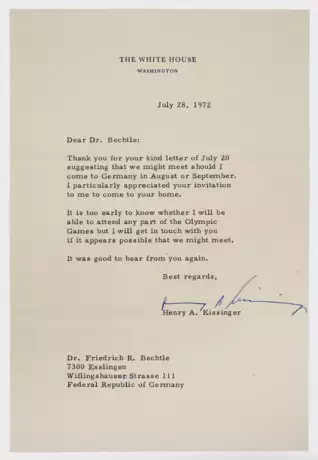 Henry Kissinger (1923 Fürth - 2023 Kent, CT), war ein republikanischer US-Politiker, der als Nationaler Sicherheitsberater und US-amerikanischer Außenminister maßgeblich die Außenpolitik Amerikas in den Jahren 1968 bis 1977 mitbestimmte und 1973 den Friedensnobelpreis erhielt. In den vorliegenden Schriftstücken bedankt er sich für Grüße und Geschenke Bechtles oder reagiert auf Einladungen des Verlegers zu Veranstaltungen in Deutschland, u.a. im Juli 1972: "It is too early to know wether I will be able to attend any part of the Olympic Games (in München, Anm. Schloss Ahlden) but I will get in touch with you if it appears possible that we might meet."