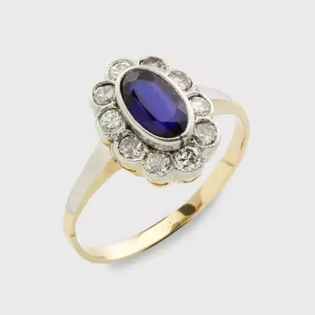 Gelbgold, 14 k, teilw. mit Silber verödet. Zentral besetzt mit einem tintenblauen Saphir im Ovalschliff, entouriert von Diamanten von ca. 0,50 ct.; Gew. ca. 2,76 g.