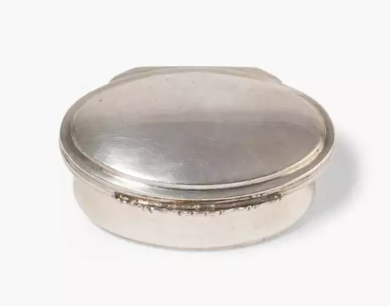 Silber, teilvergoldet. Meistermarke PHM. Ovale Form mit scharniertem Deckel und konkaver Wandung. Stadt-, Meistermarke. L 5 cm, ca. 43 g.