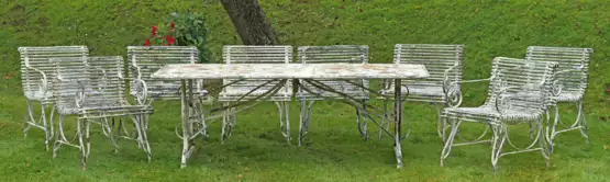 9-tlg.; Tisch und acht Armlehnstühle. Metall, weiß lackiert. Gestell aus stark geschwungenen, volutenartig angelegten Rundstäben, parallelen Streben als Sitzfläche und Rückenlehne und rechteckiger, an den Ecken gerundeter und am Rand profilierter Tischplatte. Witterungsspuren. Tisch-H. 73 cm. 203 cm x 103 cm. Sitz-H. 50 cm.