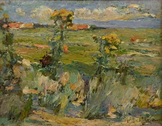 Lot 996 | Vleeschouwer, Ar. de (?) „Feldrain“, Öl/Holz, u.r. sign., 25,6x32,4cm (m.R. 33,6x40,8cm)