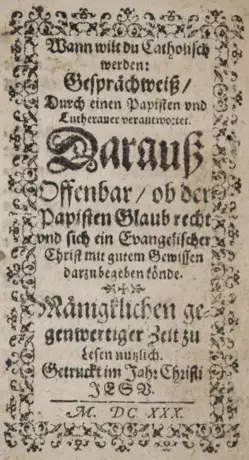 I) VD17 14:686954K. - II) VD17 23:649790U. - III) VD17 23:649796Q. - Alle 3 Werke wohl als Reaktion auf das ein Jahr zuvor erlassene Restitutionsedikt (1629) von Kaiser Ferdinand II. veröffentlicht. - Etw. gebräunt u. tls. fleckig, immer wieder kl. Wurmspuren, tls. kl. Randläsuren, die letzten 2 Bll. mit Randausriss (wenig Buchstabenverlust), Ebd. fleckig.