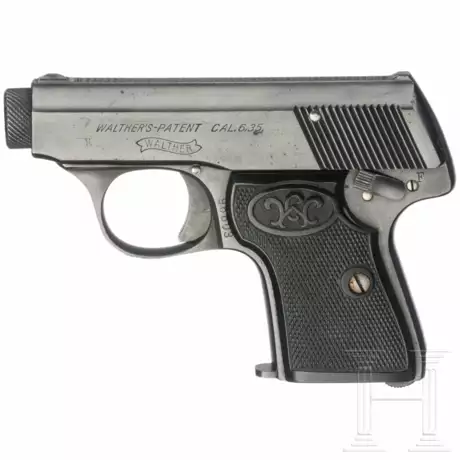 Cal. 6,35mmBrowning, SN. 96603, blanker Lauf, Länge 55 mm. Sechsschüssig. Beschuss Krone/N. Standardbeschriftung. Schwarze Brünierung, Auszieher blau. Schwarze Kunststoffgriffschalen. Magazin.