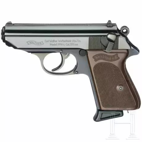 Cal. 7,65mmBrowning, SN. 505132, nummerngleich. Blanker Lauf, Länge 84 mm. Siebenschüssig. Dt. Beschuss an Lauf und Griffstück, nicht am Verschluss. Standardbeschriftung. Originale Hochglanzbrünierung am Schlitten 100%. Eloxierung am Griffstück mit wenigen, minimalen Kratzern. Braune Kunststoffgriffschalen. Das Magazin überarbeitet und neu brüniert, narbig, ungemarkt, mit schwarzem Kunststoffschuh.