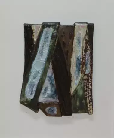 aus Majolika-Keramik in Braun-, Blau- u. Grüntönen, 1968(?). 31 x 23 x 2 cm. Auf weiße Hartfaser aufgeklebt u. dort undeutl. sign. u. bez. "300/68". Gerahmt (53 x 44 cm).