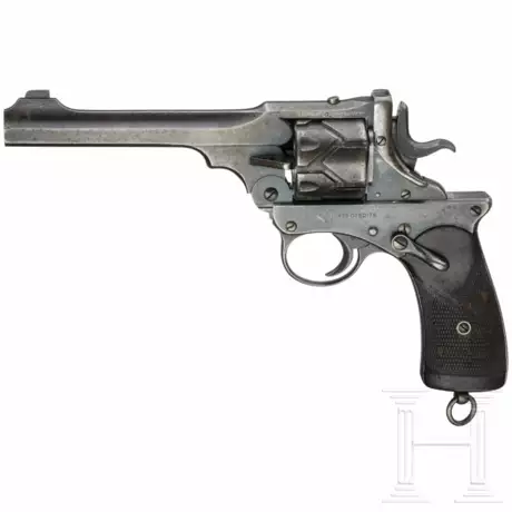 Cal. .455WebleyAuto, SN. 1566, matching numbers. Barrel length 6", bright bore. Top-break action. Six shots. British proof marks. The barrel bar marked "Army & Navy C.S.L", the top strap "Webley Fosbery", the receiver ".455 Cordite". The safety lever marked "Safe". Original finish with some thinning on barrel edges and grip straps, some signs of wear, the cylinder with rotation marks. Dark walnut grips with fine checkering, the right one with a crack. Lanyard loop.