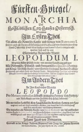 Lipperheidesche Kostümbibliothek Berlin Ea 15 (62 Tafeln). - Geschichte des Hauses Habsburg mit allen Nebenlinien und entsprechenden Porträts, meist von J. Borcking gestochen. - Einzige Ausgabe; erschien in 2 Varianten (VD17 23:232051V und VD17 3:232051V). Unser Ex. beinhaltet Merkmale beider Varianten: so entsprechen die 4 Bll. zu Beginn VD17 23:232051V (auch ohne Kupfertitel), während die Einschaltblätter von VD17 3:004527T (nur 1 Ex. in Halle) hier vorhanden sind, allerdings sind die beiden einseitig bedruckten Einschaltbll. nach S. 276 in unserem Ex. auf ein Bl. beidseitig bedruckt. - Vollständige Exemplare sind sehr selten. Meist fehlt das gefalt. Kupferblatt mit dem Porträt von Kaiser Leopold I, umgeben von 45 kleinen Medaillon-Porträts (in unserem Exemplar vorhanden). - Meist etw. gebräunt, mitunter auch stärker, Gebrauchssp.