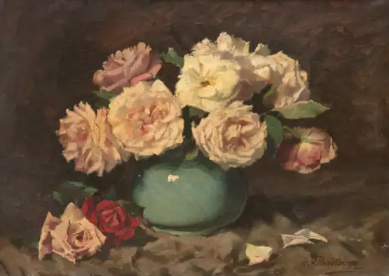 Lot 115 | Wendlberger, Wenzel Hermann "Stilleben mit Rosenstrauß in Vase", Öl/ Lw., sign. u.r., rückseitig alter Aufkleber "Kunsthandlung Pernitzsch Leipzig", 40x53 cm, Rahmen (besch.)