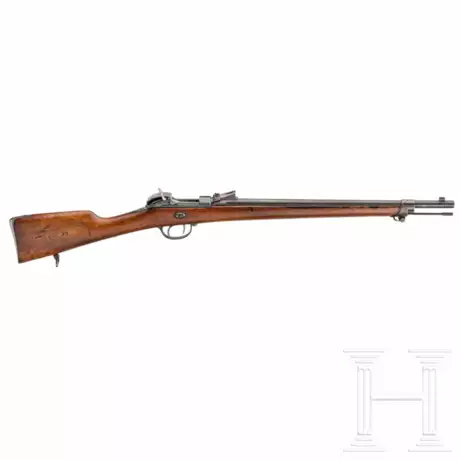 Cal. 11,15x37R, SN. 1607 , nummerngleich. Leicht rauer Lauf mit gutem Zug-/Feldprofil, Lauflänge 54 cm. Laufoberseite rudimentär lesbar "A. Francotte à Liège". Korn für Bajonettaufnahme. Schiebevisier, Skalierung 2 bis 5. Hülse, Abzugsbügel und Schrauben überarbeitet. Dunkler Nussholzschaft mit Herstellerstempel und bayer. Abnahme. Beide Riemenbügel. Entladestock. Länge 96 cm.