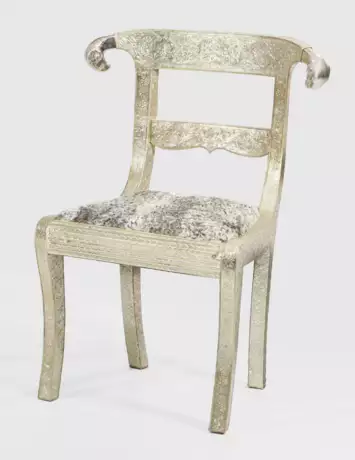 Holz, flächendeckend belegt mit floral reliefiertem Metall. Trapezförmige Zarge auf leicht ausgestellten, konischen Vierkantbeinen. Leicht zurückschwingende Rückenlehnenrahmung mit breitem, gewölbtem oberen Abschluss mit plastischen Widderköpfen. Sitzfläche gepolstert und mit grauem Lammfell bezogen. Sitz-H. 44 cm.