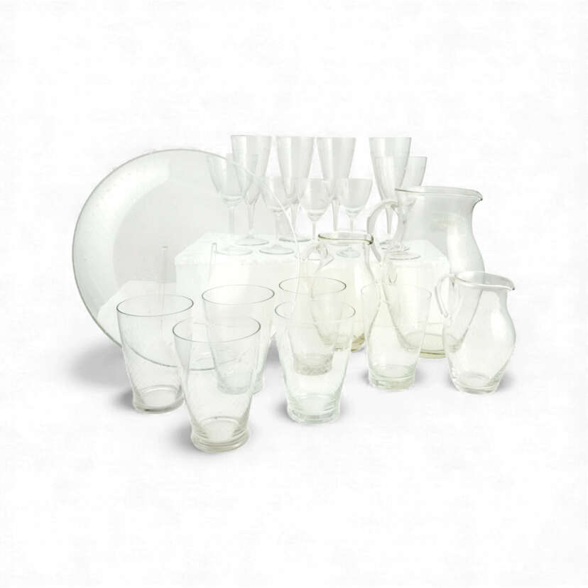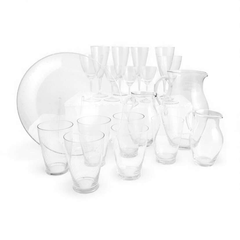 19 pieces, mid-20th century, colourless glass with diamond cut, consisting of 3 jugs, 2 wine glasses, 4 champagne glasses, 6 ribbed glasses, 3 liqueur glasses and 1 plate