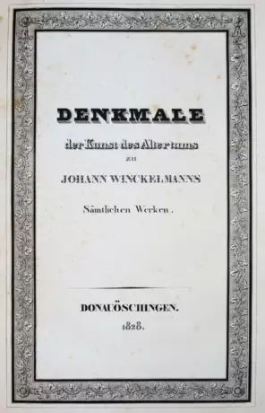 Vgl. Brieger 2586 u. Ruppert 6. - Atlas zur 12 bändigen Gesamtausgabe, dessen 2 Tle. hier zusammengebunden sind. Vorgebunden der Titel des zweiten Teils "Denkmale der Kunst des Altertums zu J. Winckelmanns sämtlichen Werken" mit dem Datum 1828. - Tit. des 1. Tls. fehlt. Durchg., tls. stärker stockfleckig, vereinzelt fingerfleckig. Tls. mit kl. Wasserfleck im unt. Blattrand.