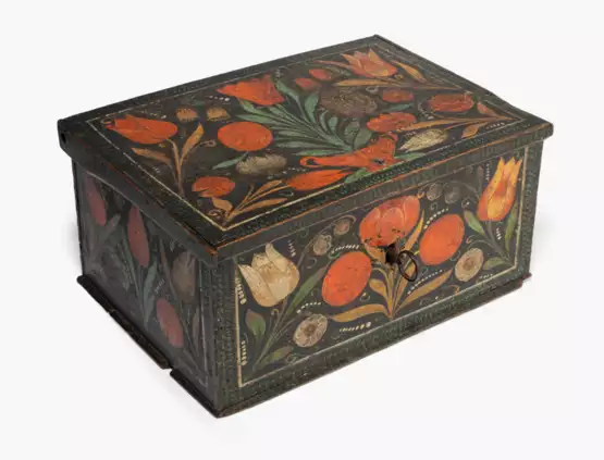 Alpenländisch, 18.Jh. Buchenholz. Eisenbeschläge. Rechteckiger Korpus mit Klappdeckel. Polychrome Malerei über Kreide- und Wismutgrund. Allseitig auf dunklem Fond grosse Blütenmotive, u.a. Tulpen und Türkenbund. Eisenschloss (wohl assortiert) mit Schlüssel. 35,5x26x17 cm.