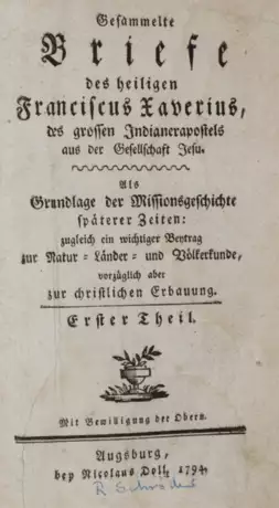 De Backer/S. III, 345 (Eglauer). Erste deutsche Ausgabe. - Über die Missionsarbeit des 16. Jhdts. in Indien. Xavier (1506-1552) war einer der Wegbereiter der christlicher Mission in Ostasien und Mitbegründer der Gesellschaft Jesu. - Tls. etw. gebräunt u. fleckig. Exlibris.