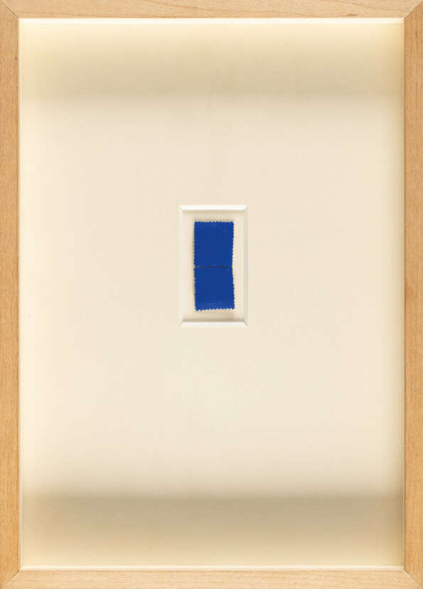 Der Künstler nutzte die blauen Briefmarken für Einladungskarten zur Ausstellung ›Propositions Monochromes‹, die im Mai 1957 in den Galerien Iris Clert und Colette Allendy stattfandt.