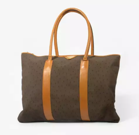 Aus braunem, strukturiertem Kunststoff mit Besätzen aus hellbraunem Leder. Goldfarbene Metallbeschläge. Zwei lange Tragegriffe. Reissverschluss. 47x32 cm.