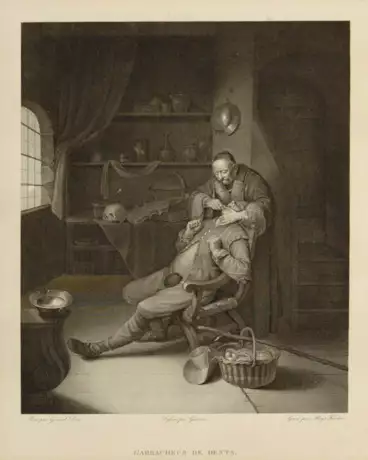 ╔Dabei: Dass.╗ Der Zahnarzt. - Der Zahnbrecher. 2 Stahlstiche v. W.French n. Dow bzw. v. W.French n. G.Honthorst bei Payne, Lpz. u. Dresden, um 1850. 8° u. Qu.8°. Alle 3 Bl. unter Glas gerahmt (nicht ausgerahmt).