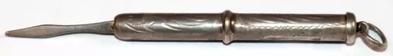 Zahnstocher, Silber (geprüft), hülsenförmiger ziselierter Korpus mit herausdrehbarer Spitze, Ges.-L. mit Öse 8 cm