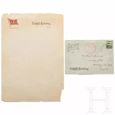 Offz. Briefbogen (A4) des LZ 129 "Hindenburg" mit passendem Umschlag, adressiert an Mrs. Elise C. Harwood USA, Poststempel vom 19.8.1936, im linken oberen Eck die handschriftliche Notiz: "This was mailed to myself with an enclosed piece of the Hindenburg writing paper - E.H". Sie hat den Briefbogen wohl als schöne Erinnerung an sich selbst gesendet. Alters- und Gebrauchsspuren.