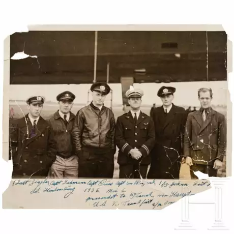 Das Foto zeigt u.a. die Luftschiffkapitäne Ernst A. Lehmann und Max Pruss, die Namen aller sechs Personen sind unterhalb handschriftlich vermerkt. Das Foto entstand am 6. Mai 1936 vor der 1. Nordamerikafahrt von Frankfurt am Main nach Lakehurst (USA), ebenfalls vermerkt ist "presendet to Frank von Hauptmann ..." - es könnte sich hierbei um Hauptmann Hans von Schiller handeln. Er war der Kommandant von LZ 127 "Graf Zeppelin". Maße des Fotos 25,5 x 20,5 cm. Alters- und Gebrauchsspuren. Eine sehr seltene Aufnahme.