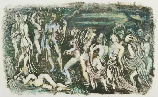 (1891 Pforzheim 1992). Weibliche Akte u. ein männlicher Akt. Farbmonotypie mit Pasellkreide überarbeitet auf Mould made J.Whatman 1949. Blgr. 49 x 61 cm. Unt. li. sign. - Stellenw. Knicksp.
