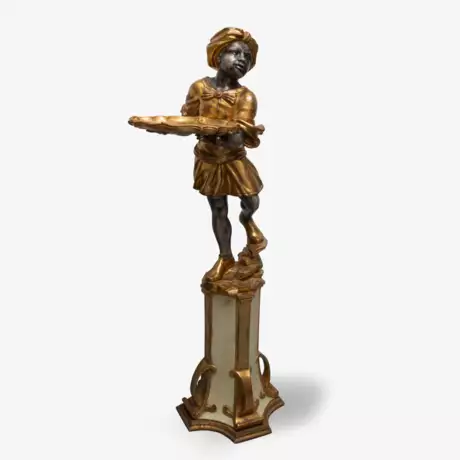 Wohl Italien, 20.Jh. Holzgeschnitzte, vergoldete und polychrom bemalte Figur eines Afrikaners mit Turban, der in der Hand ein Tablett hält. Höhe 128,5 cm.