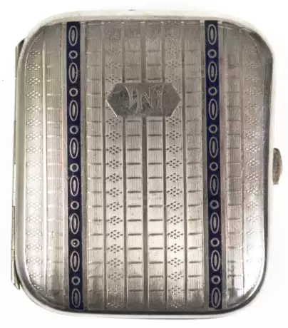 Lot 701 | Zigaretten-Etui, Alpacca, um 1920, mit ornamentalem und blauem Emaille-Dekor, monogr. "HM", 9x7,5x1,7 cm