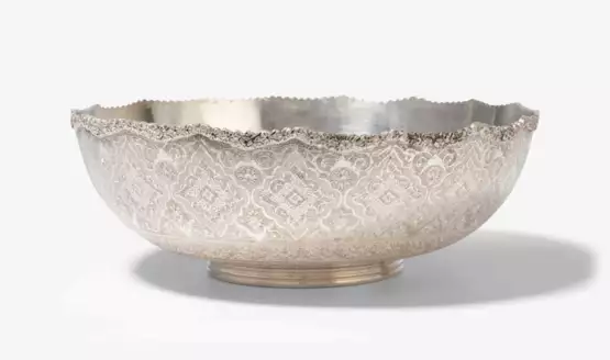Persien, 2.Hälfte 20.Jh. Silber. Boden mit vier Punzen, darunter "84" (Reinheitsgehalt) und Löwe mit Schwert. Tiefe Schale mit rundum feinem, ornamentalem Dekor. D 22,5 cm. Gewicht ca. 610 g.