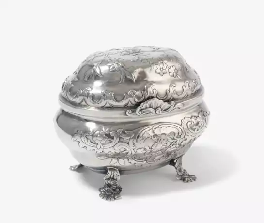 Ovalform mit konvexer Wandung und gewölbtem Deckel auf Blüten verzierten Füssen. Wandung mit flach reliefierten floralen Motiven, begleitet von Blattkartuschen und Rocaillen. 14x11 cm, ca. 264 g.
